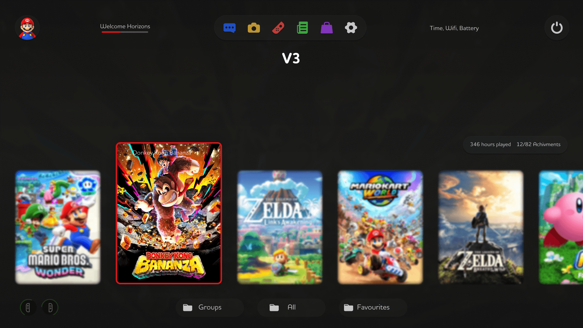 Integrated Achievement System: Finally brings a native trophy/achievement layer to the Switch. The home screen now displays game progress and total play time directly under the game tile.
